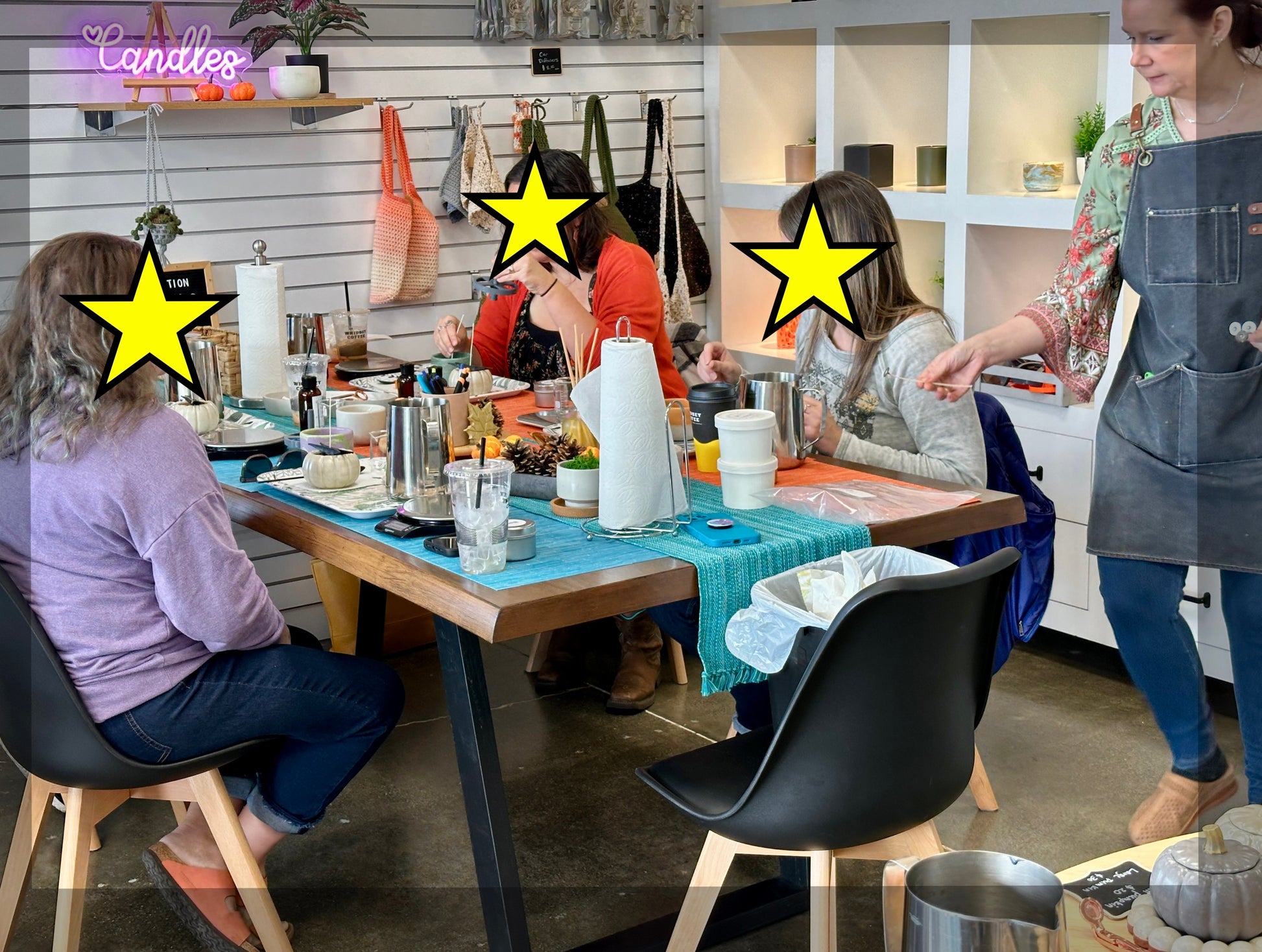 Class fees start at $45 per person, which includes creating two candles—an 8oz candle and a 4oz tin—with all the necessary supplies. If you choose a larger container, there may be additional charges. This is just a RESERVATION FEE of $20 per person, the remaining will be due at time of class.